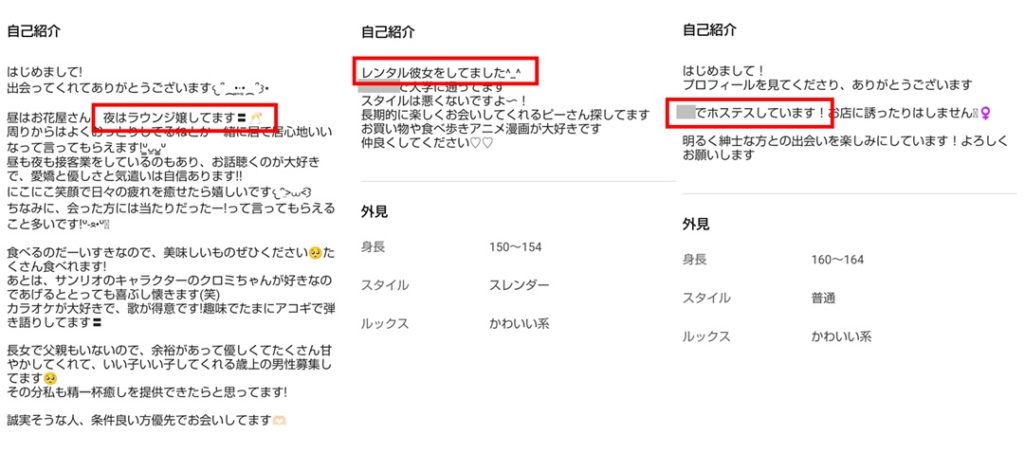 下に実際の自己紹介文の一例を載せておきますが、自分でラウンジ嬢とかレンタル彼女とかホステスとか、書いている子も多いです。