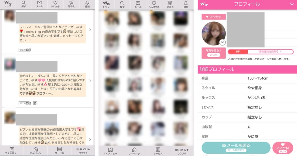 先に紹介した『PC MAX』では、プロフィール閲覧も有料ですが、『ワクワクメール』では無料です。画像左は「プロフィール検索」、画像中央は「写真検索」ですが、どちらも気に入った子をクリックして画像右のプロフィール詳細を見ても、料金は発生しません。ただし、写真は画像のように薄っすらモザイクがかかっており、写真を拡大して見る場合は、2ポイント(20円分)がかかります。