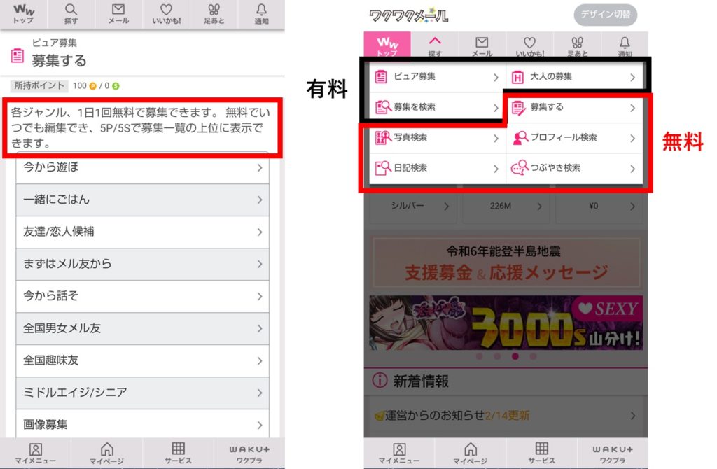 こちらも『PC MAX』では有料の「募集」が、『ワクワクメール』では無料でできます。各ジャンル1日1回ですが、ピュア募集とアダルト募集合わせて19ジャンルありますので、かなり無料で募集をかけることができます。