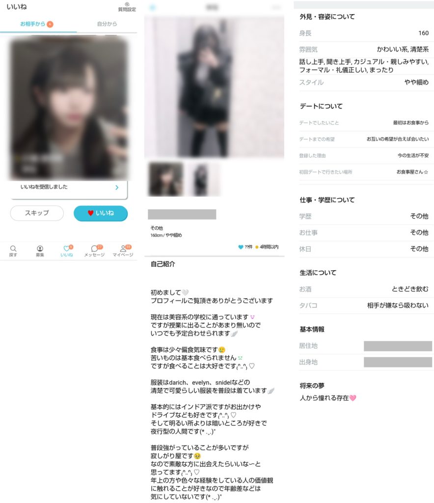 パパ活系アプリの構造は非常にシンプルで、”いいね”と”メッセージする”のみです。写真が見放題で、裏プロフィール的なものもありません。ストレートに容姿と自己紹介文と条件のみで勝負です。