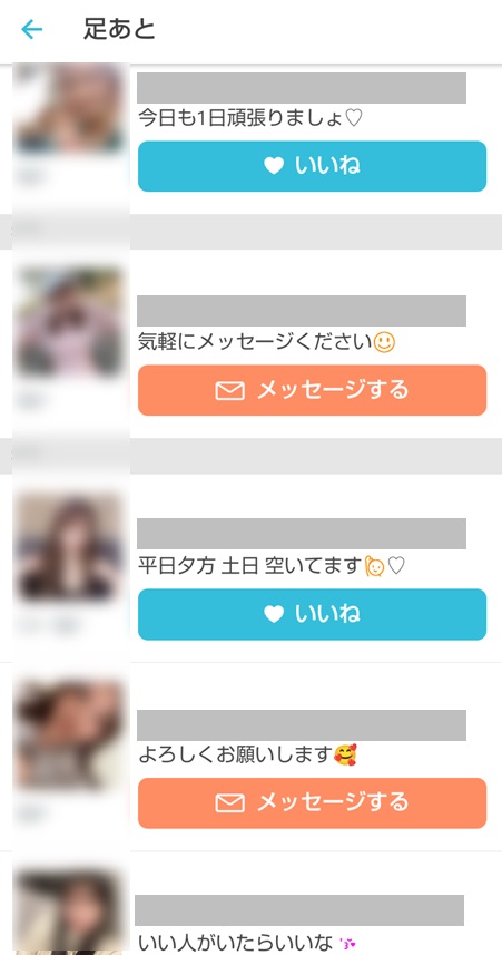 足あとも、結構つけられます。しかも足あとつけた女の子は、ほぼいいね♡してきますので、一番最初の「いいね♡ をもらう」の説明でこと足りるかと思います。