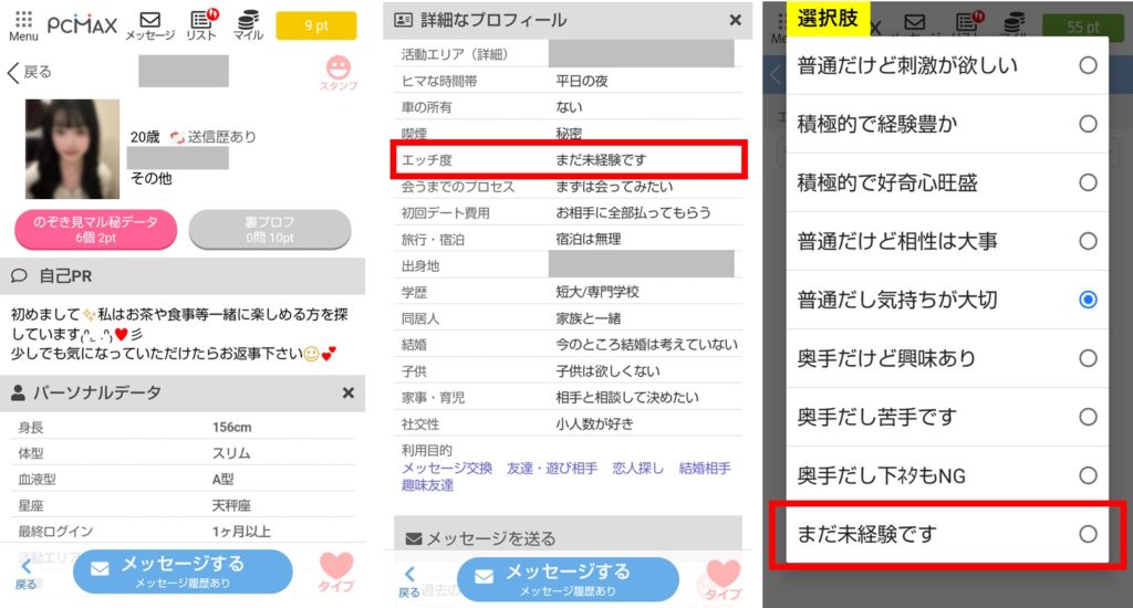 あとは、検索するときに、エッチ度=まだ未経験です を選んで検索すれば、処女がいっぱい出てきます。ただ、中には変なのも混ざっているので、そこはよく選びましょう。