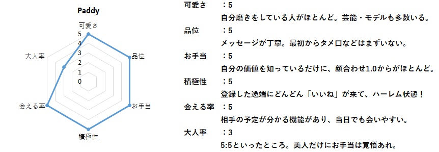 まだライバルが少ないのが狙い目。パパ活アプリと知らず、婚活や恋活系目的の子も混ざっている。ぶっちゃけ名前も中身も「Paddy」に寄せていて、利用料金はパディ以下となっている。今後に注目。