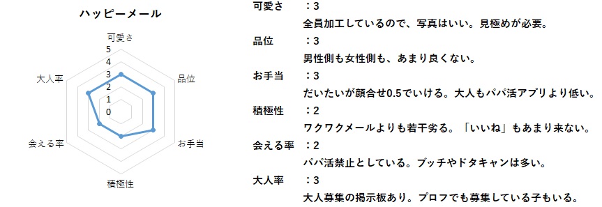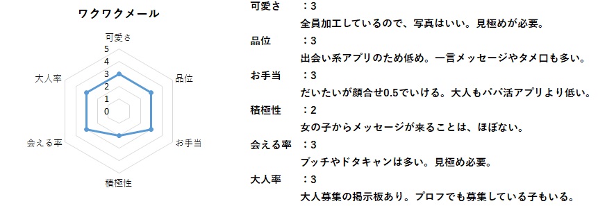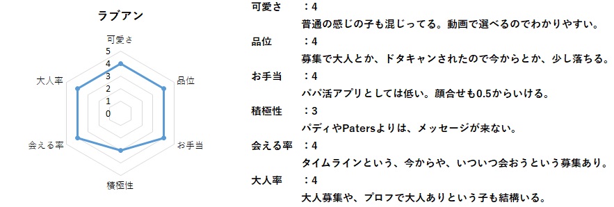 ここでは、女の子の「可愛さ」「品位」「お手当」「積極性」「会える率」「大人率」という、みなさんが少しでも理想のパパ活女子が見つけられるような、独自の視点で評価していこうと思います!
