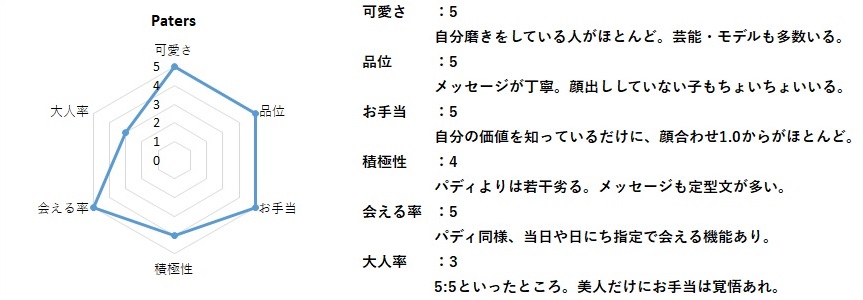 パディかPatersか、どちらか一方を登録しておけばよい。両方登録している女の子もいる。会員数でいったらPatersだが、料金は一番高い。