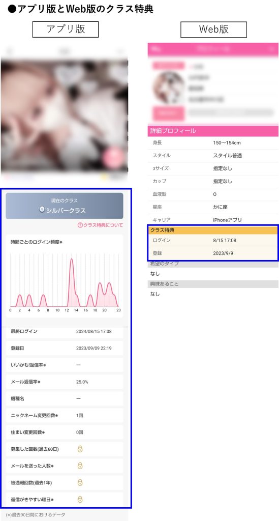 Web版のほうが、大人な情報が多く入ってくるので、Web版でやることをお勧めします。ただ、アプリ版は、1日1回ログインすると1ptもらえたり、プロフ写真が1枚無料で見れたり、クラス特典情報だけは多いので、女漁りするにはいいです。