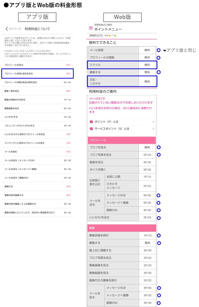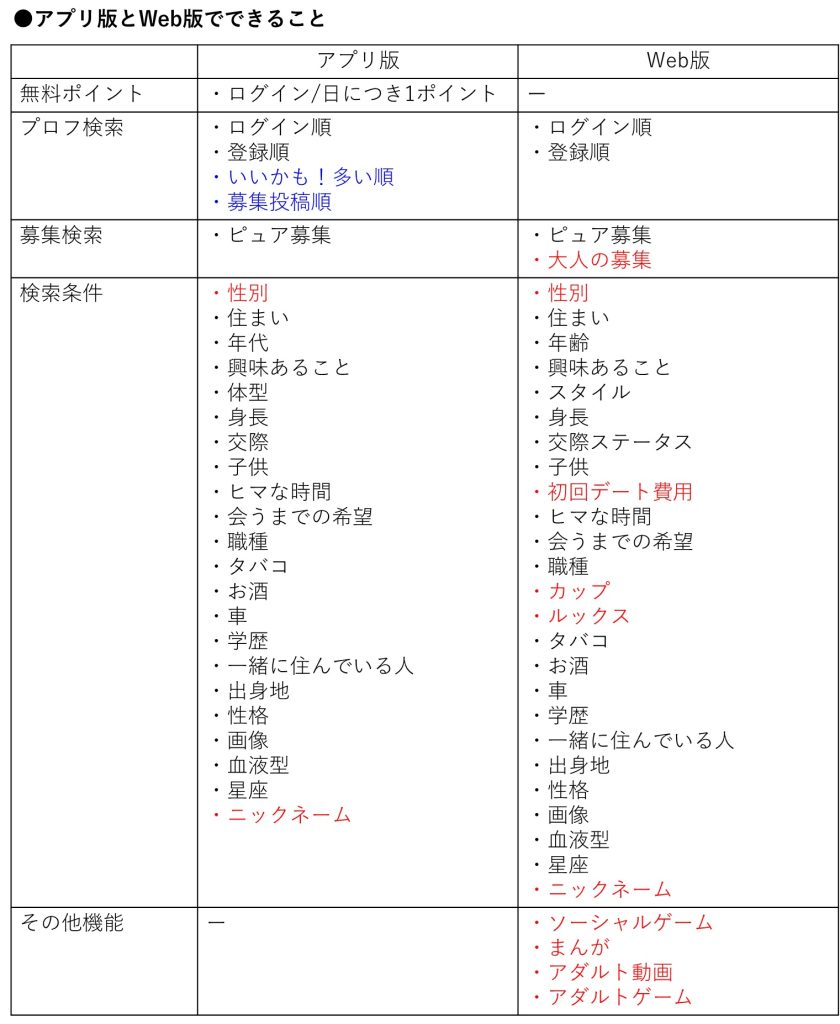 大きく違いがあるところに、色をつけました。アプリ版はWeb版よりも情報が限定的で、大人の募集やカップ数、初回デート費用など、一番大事なところが見れません。
