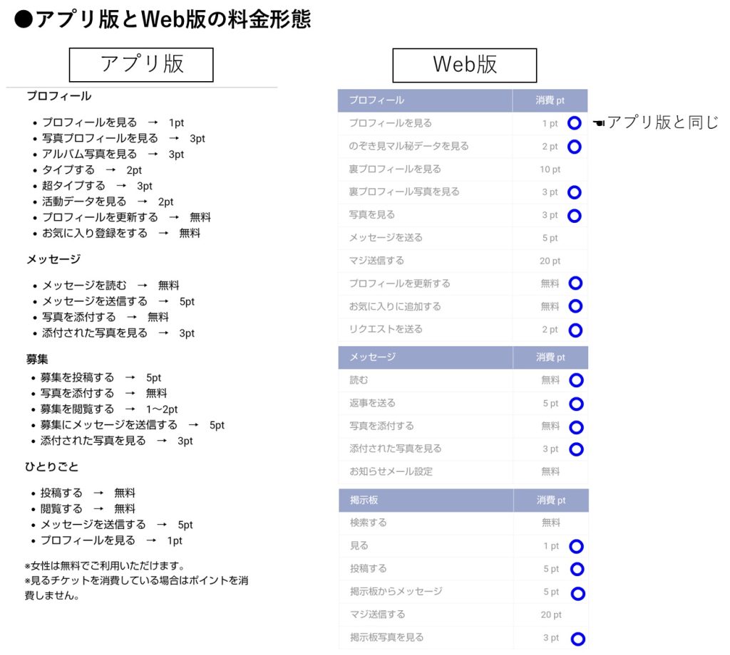 各行動のポイント形態は、ほとんど同じようですね。Web版には、「裏プロフィール」や「マジ送信」なるものがあります。