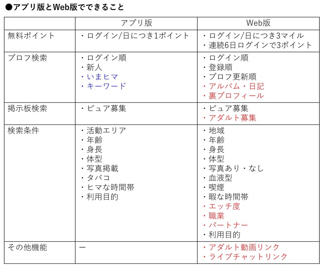 大きく違いがあるところに、色をつけました。アプリ版はWeb版よりも情報が限定的で、何よりアダルト募集の検索や、PC MAXの醍醐味である裏プロフィール・エッチ度などが見れません。